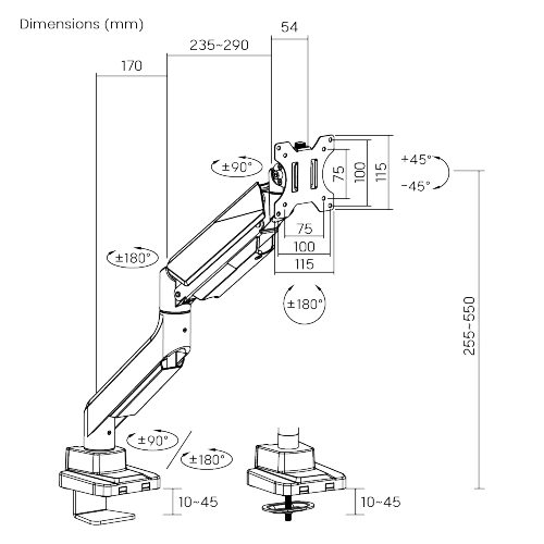 | Suggested Desktop Thickness: | Clamp:10~45mm Grommet:10~45mm (Clamp:0.39″~1.8″ Grommet:0.39″~1.8″) |