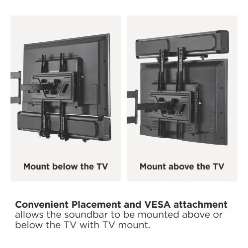 The SB-49 Versatile TV Soundbar Bracket offers the convenience to adapt to the VESA holes found on TVs, allowing the consumer to freely choose most any brand Soundbar. Mounts the Soundbar above or below the TV to optimize the listening experience no matter what size room or where furniture is placed. Best of all, the SB-49 Versatile TV Soundbar Bracket Mount is easy to install with no drilling, no holes or hard to follow instructions – resulting in a great customer experience and positive reviews.