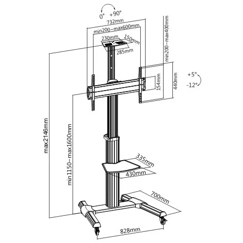 This single display TV cart with stylish, technical and functional design to provide solid presentation solution for most 37”-70” LED, LCD flat panel TVs up to 50kg/110lbs. The crank handle allows effortless height adjustment of 400mm to match different viewing needs anytime. +5°~-12° freely tilting allows easy angle adjustment and reduces glare from lights or windows to obtain the optimal viewing comfort. Solid base provides additional security by removing the possibility of tripped over and ensures reliable performance for years of use. Ideal for conferencing, public displays or other professional presentation.